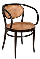 BeschreibungZwei Stühle für das Esszimmer der Firma Thonet aus den 1960er Jahren. Sie bestehen aus einem Rahmen aus schwarz lackiertem Holz, rund geformt, sowie einer ebenfalls runden Sitzfläche und Rückenlehne aus hellbrauner Flechtung. Bei einem Stuhl ist die Sitzfläche stark beschädigt, die Flechtung nicht mehr intakt. Es handelt sich um einen klassischen Bugholzstuhl vom Typ Thonet 210 R mit Wiener Geflecht und aus Buchenholz, der bereits im Jahr 1900 entworfen wurde.