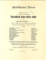 BeschreibungHandzettel des Stadttheaters Düren zur Aufführung "Hasenklein kann nichts dafür" am 3. April 1934, mit Namen der Aus- und Durchführenden